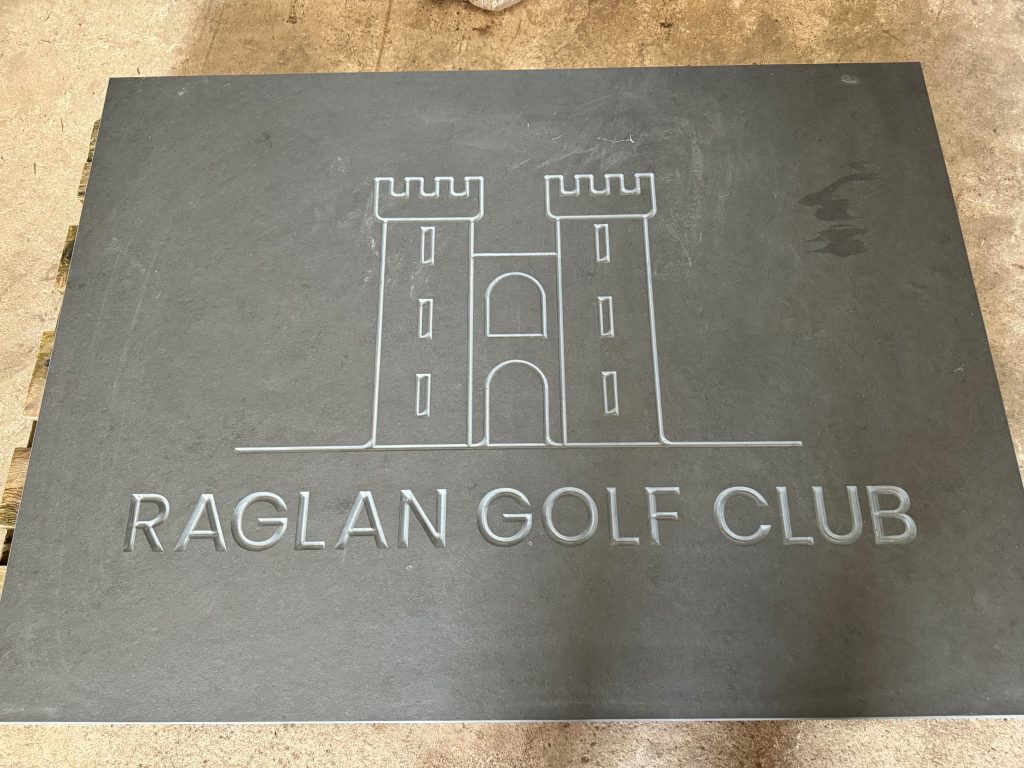 At Raglan Golf Club in Usk, South Wales, we supplied a 1200 x 900mm Ravendale slate slab engraved with the club’s logo. Installed at the entrance, the engraved slate provides a strong first impression for visitors. The natural riven surface offers a non-slip finish, while leaving the engraving unpainted ensures minimal maintenance and allows the piece to weather naturally.